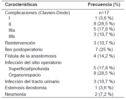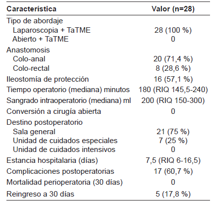 Todos los pacientes fueron tratados mediante un abordaje abdominal laparoscópico, ningún paciente requirió conversión a cirugía abierta. En todos los casos se realizó una anastomosis primaria, colo anal (71,4 %) de forma manual, o colo rectal (28,6 %) con endograpadora circular; 16 pacientes (57,1 %) requirieron una ileostomía de protección. El tiempo quirúrgico fue de 180 minutos (RIQ 145,5-240 minutos) y el sangrado intraoperatorio promedio fue de 200 ml (RIQ 150-300 ml). Siete pacientes (25 %) requirieron traslado a unidad de cuidados especiales (UCE), 21 fueron enviados a hospitalización en sala general y ningún paciente requirió seguimiento en la unidad de cuidados intensivos. La mediana de hospitalización fue de 7,5 días (RIQ 6-16,5 días) (Tabla 2).
