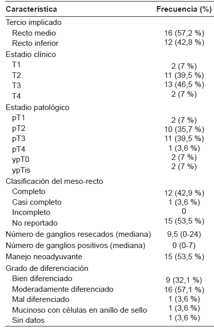 En 27 pacientes el resultado de patología informó adenocarcinoma, en el restante un carcinoma escamo celular mal diferenciado. En 15 pacientes (46,5 %), no se incluyó la evaluación macroscópica del meso-recto de los especímenes quirúrgicos según la clasificación de Quirke 11; en 12 pacientes (42,9 %) fue reportado como “resección completa” (Quirke 3) y en un paciente (3,5 %) como “casi completa” (Quirke 2); ningún paciente fue reportado como “incompleto” (Quirke 1). Solo en un caso se informó margen circunferencial radial positivo. La mediana de ganglios resecados fue de 9,5 con un rango entre 0-24; en dos casos no se dispuso de esta información (Tabla 4).