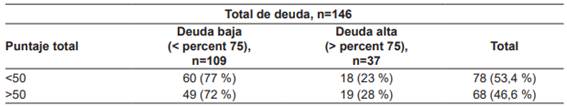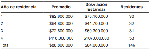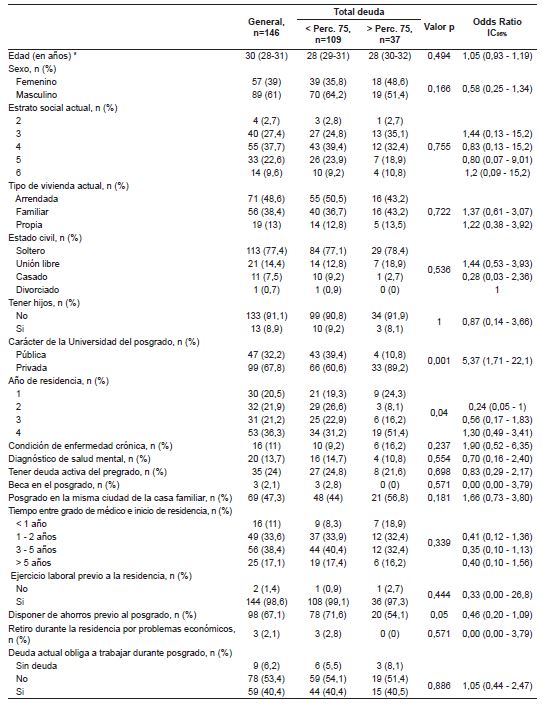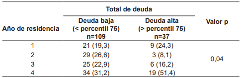 El 56 % de los participantes (146 residentes) tenían deuda económica relacionada con sus estudios de posgrado (Tabla 1) y el promedio de la deuda al momento de la encuesta correspondía a COP $88.000.000 (US $21.826), con una mediana de COP $60.000.000 (US $14.882) y un rango intercuartílico (RIQ) de $30.000.000 - COP $130.000.000 ($7.441 - US $32.244). Una deuda económica alta (> percentil 75) correspondiente a una suma igual o superior a COP $130.000.000 (US $32.244), la cual se identificó en 25,3 % de los participantes (Tabla 2). Un residente de cuarto año de Cirugía general en Colombia tiene una deuda promedio de COP $116.000.000 (US $28.771) y el 51,4 % (19/37) de los residentes de cuarto año tienen un nivel de deuda alto.