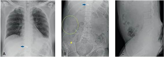 Serie de abdomen donde mencionan que existe una burbuja gaseosa en el flanco y fosa ilíaca derecha, sugestiva de neumoperitoneo (circulo verde). Además, hay destrucción y resorción de la cabeza femoral derecha (junto a la estrella amarilla), asociado con luxación coxofemoral, y alteración en la esfericidad de la cabeza femoral izquierda, la cual presenta osificaciones heterotópicas en el espacio articular coxofemoral. Diástasis de la sínfisis púbica en aproximadamente 5 cm. Proyectil de arma de fuego localizado en el margen posterior del cuerpo vertebral T12 (flecha azul).