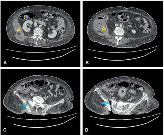 A y B. Tomografía computarizada de abdomen y pelvis donde se aprecian la colección multiloculada (estrella amarilla) localizada en la gotera parietocólica, que se extiende hasta la región perihepática entre el segmento VI y el diafragma, compromete los tejidos blandos de la pared torácica posterolateral, con extensión entre el aspecto inferior del músculo latísimo del dorso, el cuadrado lumbar y el erector de la espina, en el sentido inferior se extiende hasta la fosa ilíaca derecha, se encuentra en contacto con la pared lateral del colon ascendente y los músculos oblicuos, mide 20 x 8 x 6 cm en los ejes longitudinal, anteroposterior y transverso respectivamente, con volumen calculado de 500 ml. C y D. Además, se visualiza el extenso proceso inflamatorio que compromete los tejidos blandos de la región sacra, perineal y el ano, con aumento difuso y heterogéneo en la densidad del tejido celular subcutáneo e irregularidad de la dermis, y en la unión posterior de la articulación sacroilíaca derecha (flecha azul), se observa defecto en la continuidad de los tejidos blandos, la cual probablemente esté comunicada con la colección en la gotera parietocólica ipsilateral.