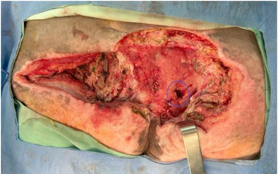 Fotografía intraoperatoria donde se puede observar la extensión de la úlcera, que había comprometido el hueso sacro y tenía una comunicación con la articulación sacroilíaca (circulo azul), a través de la cual pasó la infección al retroperitoneo y al espacio extraperitoneal lateral derecho.