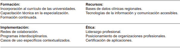 Presentamos a continuación un marco para desarrollo del uso ético de la IA (Tabla 1), para mejorar el acceso a una cirugía basada en valor en Latinoamérica, donde los actores clave serán los profesionales médicos y sus sociedades, universidades y academias médicas, así como los gobiernos a través del Ministerio de Salud, en conjunto con desarrolladores tecnológicos.
