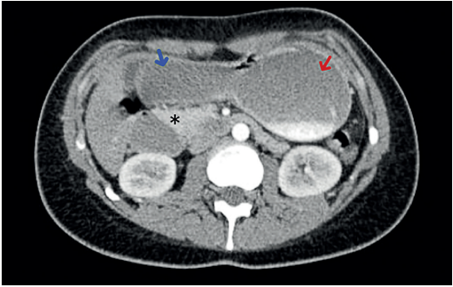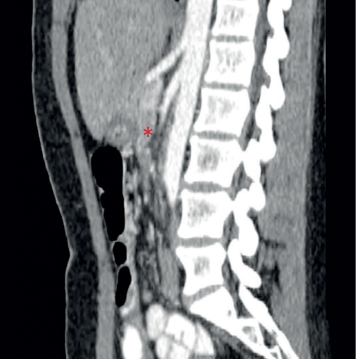Presentamos el caso de una paciente de 22 años de edad, con antecedente de trastorno límite de la personalidad, consultante en múltiples ocasiones al servicio de urgencias por náuseas y episodios eméticos persistentes, asociados a dolor y distensión abdominal. La tomografía computarizada (TC) de abdomen con contraste evidenció disminución del ángulo y la distancia entre la aorta y la arteria mesentérica superior, confirmando el diagnóstico de síndrome de Wilkie (Figura 2), por lo que se inició manejo médico, pero fue fallido.
