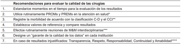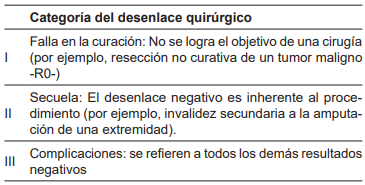 Un documento de consenso multicéntrico 22, creado por autoridades mundiales en el tema, cuya lectura es ampliamente recomendada y escapa del alcance de este escrito, establece siete recomendaciones con respecto a la evaluación de los desenlaces quirúrgicos, con una perspectiva integradora, y resalta las complicaciones quirúrgicas como un evaluador de la calidad de las intervenciones quirúrgicas (Tabla 3).