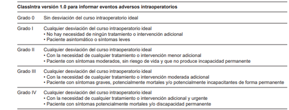 Por consiguiente, una estimación completa de las complicaciones quirúrgicas debe contemplar un período de evaluación intraoperatorio y un período de evaluación postoperatorio (primeros 30 días) de forma simultánea. La Classification Scale for Intraoperative Adverse Events (ClassIntra) responde a este vacío y evalúa el periodo intraoperatorio (Tabla 2). Se encuentra validada y, de forma análoga a la escala de Clavien-Dindo, estratifica la gravedad según el tratamiento y el impacto en el paciente 24-25.