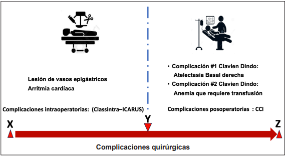La taxonomía de las complicaciones quirúrgicas propuesta por los doctores Clavien-Dindo se basa en el impacto clínico y su gravedad, así como en las acciones utilizadas para su corrección. Sin embargo, la ocurrencia de varias complicaciones en el mismo paciente ilustra la dificultad para su adecuada evaluación dentro de estos casos particulares. Proponemos el ejemplo siguiente: