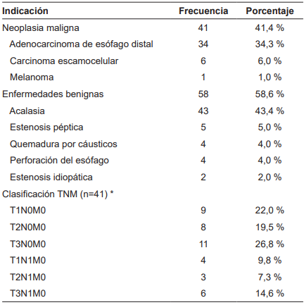 En 41 pacientes (41,4 %) se llevó a cabo una EMI por neoplasias del esófago y en 58 (58,6 %) por enfermedades benignas (Tabla 1). En este último grupo, 43 pacientes tenían acalasia, a 21 de ellos se les habían practicado miotomía de Heller, 20 por vía abdominal y 1 por vía torácica, con dilataciones en 14; 17 tenían un megaesófago asociado. Cinco pacientes sin antecedente de cirugía previa tenían megaesófago o esófago sigmoideo. La indicación quirúrgica de la esofagectomía en todos estos casos fue la disfagia recurrente.
