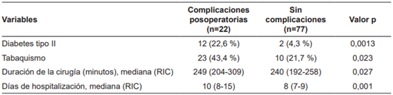 En el análisis bivariado se identificaron las siguientes variables relacionadas de manera estadísticamente significativa con el desarrollo de complicaciones posoperatorias: diabetes mellitus, historia de tabaquismo, tiempo quirúrgico y estancia hospitalaria (p<0,001). Además, con el análisis de regresión logística donde se evaluaron estas variables, se identificaron como factores independientes asociados con el desarrollo de complicaciones de la EMI la diabetes mellitus (OR 8,9; IC95% 1,58 - 51,9; p=0,0013) y la hospitalización prolongada (OR 1,4; IC95% 1,15 - 1,79; p=0,01) (Tabla 2).