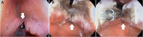 Teniendo en cuenta que la resección tradicional vía abierta o por vía toracoscópica tiene un riesgo de complicaciones entre el 15 % al 37 %, que son considerados valores altos para una entidad benigna 9,10, en esta paciente se practicó una sección de la pared esofágica con clutch cutter, seccionando y coagulando las fibras musculares, y posteriormente se colocaron clips para dejar una sola luz esofágica, como se demuestra en las imágenes.