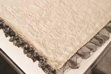 The textile’s definite place of origin has yet to be established, although the whitework characteristics resemble traditional Ayrshire embroidery, as well as bobbin lace, commonly produced throughout Western Europe in the nineteenth century (García-Vedrenne & Kuhliger 2015:53-66). Black and white textiles have commonly been associated with funerary practices in a European context (Flavin 2014:129). It is thought that Cortes’ descendants (an Italian family whose surname was Pignatelli) bought, or requested, the facture of the cloth for the exequies that took place in 1794 as part of a death memorial (cfr.Almarza 1946:14). This idea is further supported by the existence of the embroidered initials HC (an indication of Hernan Cortes’ property) which were dissociated from the cloth during the conservation treatment and only recently found (cfr.García-Vedrenne, in press).