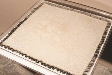 The conservation treatment focused on stabilising the object. The original stitching was documented and removed so that the lace could be treated separately (García-Vedrenne & Kuhliger 2015:53-66). The silk lace fibres were consolidated and backed with a stitched silk-net support. Purified water was sprayed over the embroidered linen cloth and blotted to reduce creases, dislocations and deformation (García-Vedrenne & Kuhliger 2015:53-66). In my opinion, this process also worked as a cleaning treatment, although it was not aimed at completely removing the evidential soiling (Brooks & Eastop 2006:171-181). A plain-weave cotton fabric was dyed and placed as a support for the funerary cloth using self-couching stitching to stabilise areas of loss (Figure 4) (García-Vedrenne & Kuhliger 2015:53-66).