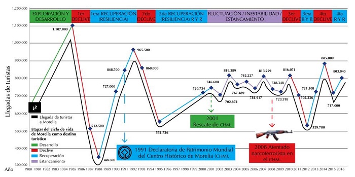 Actualmente es perceptible la manera en que se emplea la etiqueta turístico-patrimonial como Ciudad Mexicana Patrimonio Mundial, al promover costosas infraestructuras urbanas, como espectáculos de luz y sonido, o la peatonalización de calles, justificándolas, así como otras acciones, mediante el discurso del anhelado desarrollo local a partir del turismo, lo que genera polémicas de diversos tipos. Sin embargo, el crecimiento sostenido de la actividad turística cultural local no se refleja claramente a partir de información recabada sistemáticamente y en la llegada de turismo a la ciudad, escenario notorio en el análisis del ciclo de vida del turismo en Morelia, el cual se presentó en la figura 6.