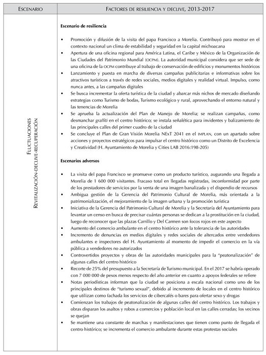 Al retomar los conceptos antes señalados, coincido con Torres (2003:101) en que la planificación de la actividad turística exige establecer instrumentos de prevención de riesgos, control y gestión urbana, conservación integral del patrimonio, desarrollo social, etc., para prever las presiones e incentivar procesos de resiliencia en destinos turísticos patrimoniales. Se debe tener en cuenta que el proceso de recuperación de una crisis no siempre depende de la adecuada rehabilitación, restauración o adaptación funcional de los monumentos históricos (arquitectónicos o urbanos) para la visita turística. La inseguridad, la marginación, los conflictos y manifestaciones sociales, la falta de servicios e infraestructura para hacer operacional y funcional para todos (discapacitados, personas de la tercera edad, por ejemplo) el destino y sus inmuebles patrimoniales, la desarticulación de las políticas públicas y los inoperantes marcos legales de planificación urbana son factores que reducen drásticamente la capacidad de resiliencia de un sitio histórico-turístico. Este contexto es común en muchas ciudades patrimoniales en México, entre ellas, la que me ocupa: Morelia (Barrios 2012; Hiriart 2016a; Barrera 2017).