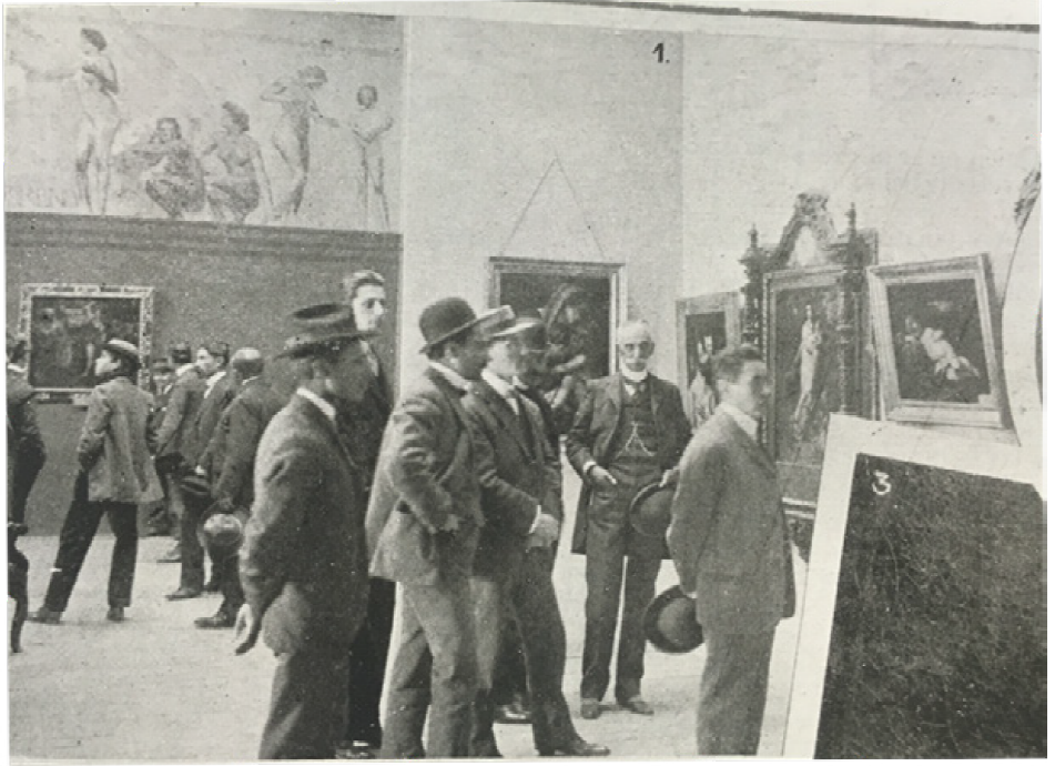 Así, aquellos trabajos hacen mención tanto de la realización del mural como del acomodo de las piezas en los muros: “[…] no son de gran interés, justo es decirlo, la mayor parte de las pinturas, pero, en cambio, hay 23 obras, que son de un mérito grande” (La Gran Colección […], 1909, p. 12). En la fotografía mencionada anteriormente se ven algunas de las obras seleccionadas para la exposición, montadas siguiendo una sola línea y dejando suficiente espacio entre ellas, lo cual lleva a pensar en un montaje moderno que buscaba la apreciación individual de las obras, a diferencia del atiborramiento que comúnmente se gastaba en las galerías y salones de la Academia.