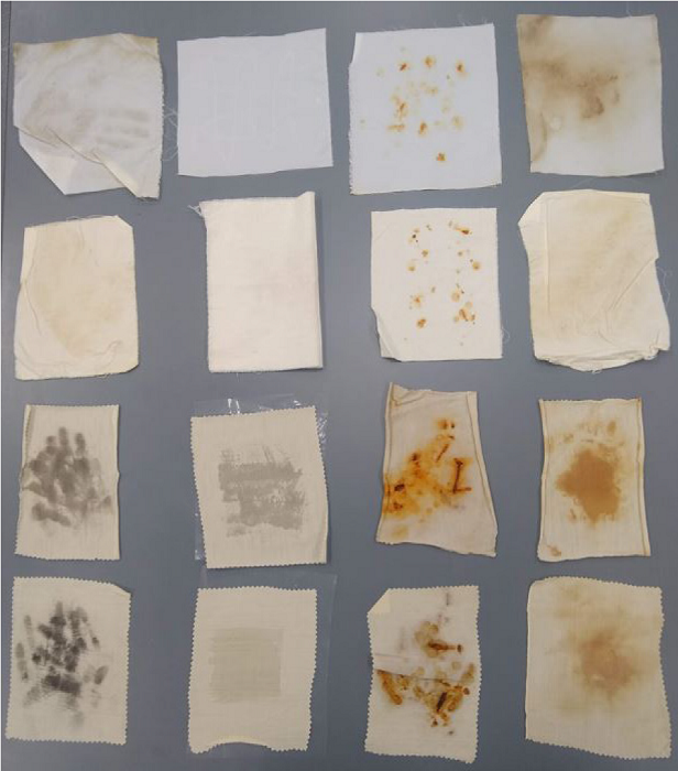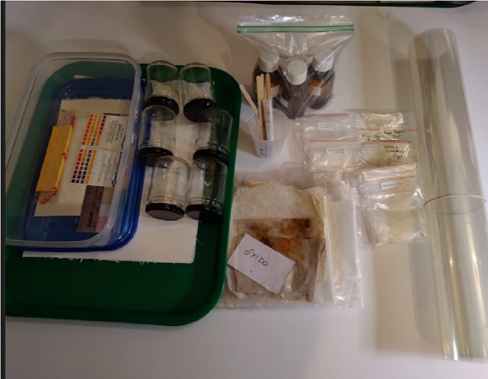 Para asegurar a todas las participantes una experimentación sobre las mismas bases, la inscripción incluía un kit de materiales (Figura 1), que consta de telas manchadas sobre las que realizar la experimentación y materiales para la aplicación de soluciones de limpieza y geles. La búsqueda y la adquisición de éstos en cada localidad, ya que resultaba fundamental obtener experiencias con base en la disponibilidad regional, también demandó esfuerzo.