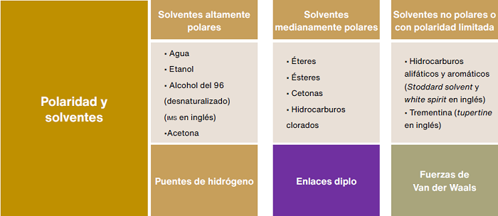 Las materias se presentaron visual, dinámica, clara y esquemáticamente. Destacó en ello el uso de cuadros-resúmenes para reforzar de manera gráfica los conceptos más importantes (Figura 3). El plan de estudios abarcaba diferentes unidades temáticas: las características fisicoquímicas de los textiles, los tipos de manchas y el agua; descripción de manchas y su análisis; sistemas de limpieza, pH y agentes limpiadores; solubilidad de manchas, y sistemas de limpieza localizada, preparación de geles y su aplicación.
