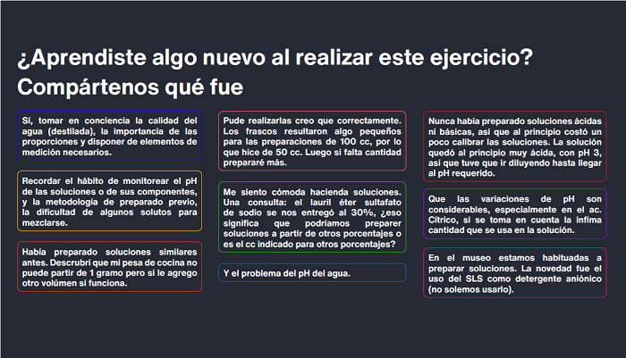 Ciertamente, el aspecto más valorado por las participantes fue la entrega de las instructoras, tanto en lo relativo a su calidez y excelente disposición para compartir información y resolver dudas como a la sencillez con la que fueron capaces de explicar temas complejos, como nociones de estructuras e interacciones químicas. La sensación generalizada de la audiencia al finalizar el curso fue de gratitud, pues las profesoras lograron motivar y generar interés en torno de un conocimiento nuevo que debe ampliarse a futuro. Así lo mencionó una de las asistentes: “La información y la práctica que nos brindaron fueron muy importantes. Lo más valioso es que nos presentaron materiales y formas de trabajo que nos dan herramientas sólidas para emprender un camino que debemos profundizar con más práctica, estudio y experimentación. Además de las clases, todo el material bibliográfico que nos brindaron fue excelente” (Evaluación del curso Disolver para remover, 16 de septiembre de 2021).