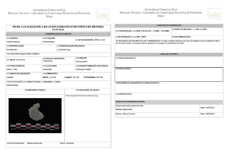 La NHC/UFPA se encuentra en la reserva técnica del curso de museología, junto con la colección de la Amazonia, aunque están en salas separadas. Originalmente se pensó en un plan de interoperabilidad entre ambos acervos, lo que dio lugar a un formulario (Figura 1) que se basa en el modelo actual y lo adapta a la colección paleontológica. Sin embargo, las adaptaciones no resultaron en una interoperabilidad eficiente entre los campos debido a las diferencias en las normas aplicables y el tipo de información. Cabe mencionar que la colección se diseñó con el objetivo de expandirse a otras áreas del conocimiento natural, pero el documento de registro no reflejaba esta intención, lo que representó un problema para la gestión.