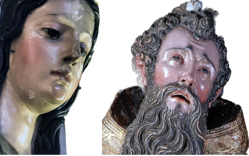 Las intervenciones, sin embargo, suelen no apegarse a la unidad, como metaconcepto; o, peor aún, se alude a ello sin reparar en las implicaciones prácticas que esto debería traer en la toma de decisiones. Así, hemos visto cómo pinturas, esculturas y muebles de un mismo retablo se trabajan de manera aislada, acciones, en el mejor de los casos, sustentadas en un diálogo entre los equipos de trabajo para lograr los mismos objetivos y criterios de intervención, así como niveles de acción; o bien, restauraciones de una misma escultura que, como no se consideraron sus dos partes como una sola unidad, se reconstruyeron de manera independiente con criterios distintos, se resolvieron con reconstrucciones de una y otra de manera independiente. En el caso de San Elías, la unidad se reconoció más allá de la propia escultura. Con la ayuda de otras disciplinas fue posible saber que esa obra es uno de los eslabones de la cadena de esculturas manufacturadas por los mismos artífices o entalladores o policromadores o ambos, lo cual autoriza realizar de manera idéntica un tratamiento de lagunas en los ejemplares que hemos podido intervenir dentro del STREP (Figura 7). En todos los casos se ha buscado recuperar la unidad potencial mermada, trayendo con la reintegración los detalles perdidos que, hallados en las decoraciones de las demás, estaban perdidos. La posibilidad de hacer esto reside en la multidisciplina y en un trabajo metodológico para su estudio y su cotejo con otras piezas de la época, permitiendo generar resultados uniformes, sin falsificaciones estilísticas, aplicando la teoría a la práctica de la restauración.