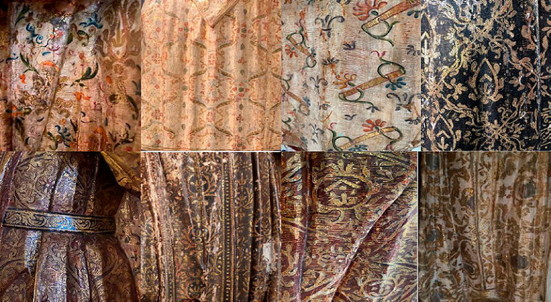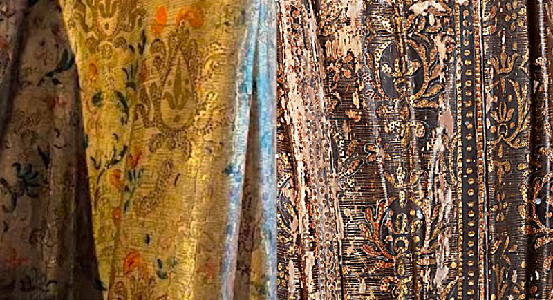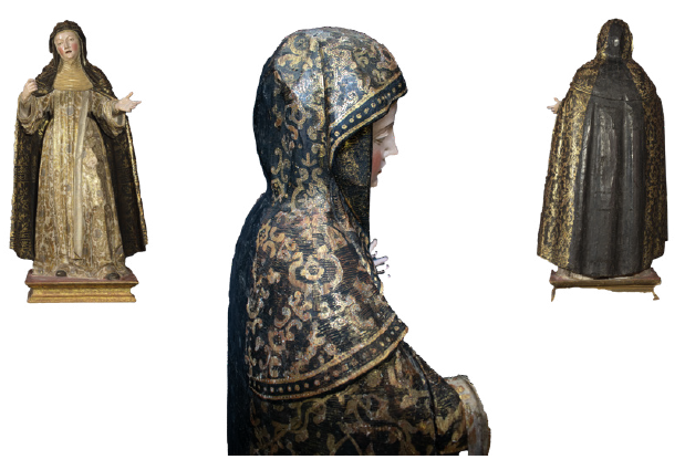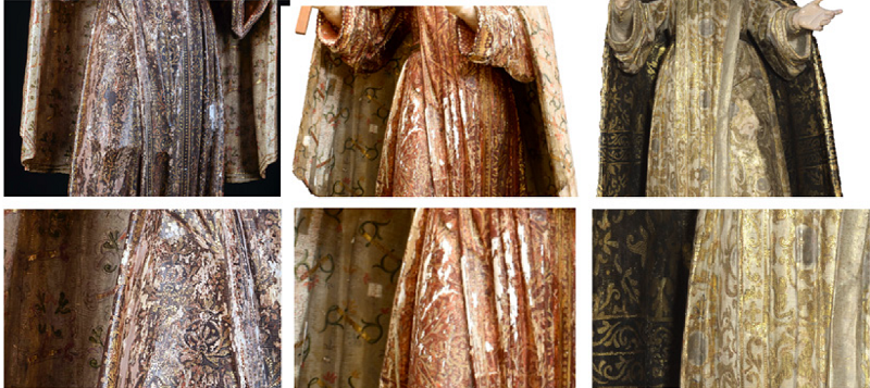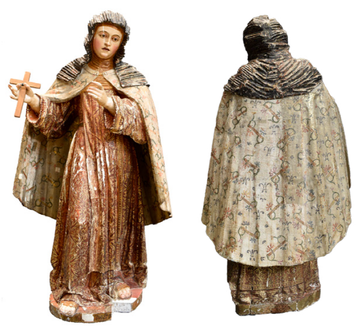 También se han identificado en otras tres esculturas trabajadas en el STREP, a saber: Santa Magdalena de Pazzi(Figura 4) y Santa Catalina de Siena(Figura 5), ambas de la parroquia de San Pedro Apóstol, Tláhuac, y el San Diego de Alcalá, de la Catedral de Corpus Christi, Tlalnepantla, Estado de México; aunque la policromía de este último caso podría ser más temprana, todas ellas dejan ver no sólo un mismo modelo que copia y repite los diseños, sino también que es similar la manera en que el pintor “policromador” resuelve las formas para dotar de volumen a las figuras (Figura 6).