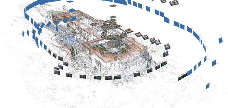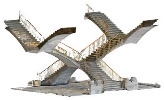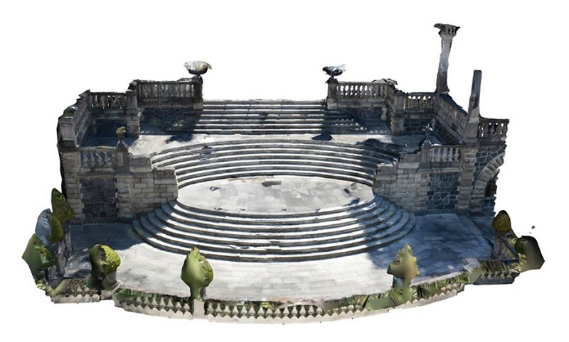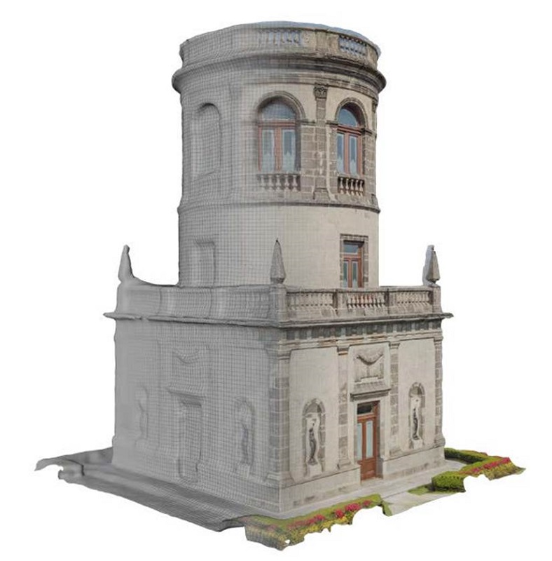 Los espacios arquitectónicos en el museo en el que se hicieron los ejercicios fueron los conocidos como Caballero Alto, torre ubicada en el Jardín del Alcázar, las salas del comedor y de lectura, y la Escalera de los Leones, en el Alcázar, así como, la escalinata en el Jardín de las Pérgolas y un objeto histórico metálico definido como samovar. Uno de los retos fue aprender a trabajar con los equipos informáticos con los que se contaba, puesto que no todos los participantes tenían un Iphone con las características indicadas y, en el caso de las laptops, ya fueran PC o Mac, prácticamente ninguna tenía la capacidad para procesar tanta información. Sin embargo, el análisis de la situación fue fructífero porque se lograron modelos tridimensionales completos y de alta resolución (Figuras 2, 3, 4, 5, 6, 7 y 8).