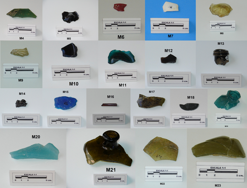 El grupo más numeroso concierne al color verde con tonalidades diferentes; las muestras fueron: la 4, 9, 11, 17, 18, 21, 22 y 23. La número 4 es verde fuerte y corresponde a una porción semiesférica de hombro de licorera con un severo deterioro en su superficie y desprendimiento de pequeñas lajas. La muestra 9, verde claro, de forma irregular, decorada con tres líneas blancas de grosor intermedio, pareciera ser, por su moderada concavidad, la base de una copa. La 11, verde aguamarina, es un fragmento del fondo de una licorera. La 17, de color verde olivo y de forma irregular, hace suponer que es una fracción de hombro de licorera, cuya superficie es de aspecto rugoso con adherencias e irisación en tonalidades de azul. La muestra 18, de color verde oscuro, es de forma oval, convexidad apenas visible y grosor delgado, con superficies deterioradas: por estas características, correspondería a un trozo de lente. La 21, de verde intenso, es un fragmento amplio de botella con labio no uniforme y cuello corto, por lo que formaba parte de un frasco contenedor de algún material de laboratorio, cuya cara interna es rugosa y con ligera iridiscencia. La muestra 22, verde olivo amarillento, se supone, por su convexidad, que es fragmento de botella: su superficie externa presenta irisación y adherencias informes. La 23, de color verde opaco que, por ser convexa, hace suponer que corresponde a un fragmento de botella, presenta perforaciones pequeñas y burbujas numerosas.