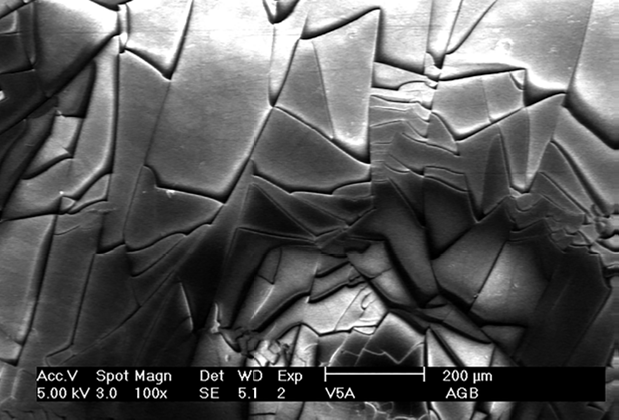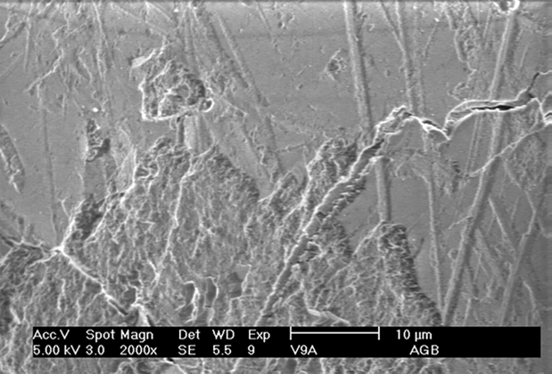 Específicamente en las muestras analizadas en el presente trabajo se detectó a simple vista iridiscencia de tonalidades amarillenta y azulosa en su superficie, desprendimiento de delgadas fracciones en forma de escamas, adherencias de color café claro y rayaduras. Al observarse fracciones pequeñas al microscopio electrónico de barrido se detectaron manifestaciones en el relieve de la superficie. Las muestras 5 y 6 presentaron superficies irregulares, con patrón de angulación (Figura 3) y curvilínea a manera de piezas de rompecabezas, aspecto que no se observó en el resto de los fragmentos. Es probable que notorias variaciones de los integrantes químicos detectadas en estas muestras repercutan en la organización molecular y, a su vez, en la estructura física microscópica, como ocurre en el caso de la muestra 5, que presentó alto porcentaje de SiO2, y la muestra 6, por corresponder a un fragmento de vidrio hyalith.