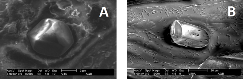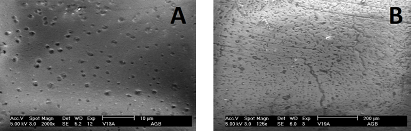 El resto de las muestras, independientemente de que sean vidrios sódicos o cálcicos presentan modificaciones en los relieves de las superficies ocasionadas por excavaciones puntiformes pequeñas, unas con bordes regulares como la muestra 13 (Figura 4A) y otras de borde irregular interpuestas entre surcos tortuosos, como en las muestras 10 y 19 (Figura 4B). Trabajos previos han reportado que los vidrios sódicos son más resistentes al medio ambiente que los potásicos (Bettembourg, 1976, pp. 36-42), sin embargo, esto no fue así en el presente estudio, lo cual podría deberse a las características del medio y el tiempo de exposición a éste.