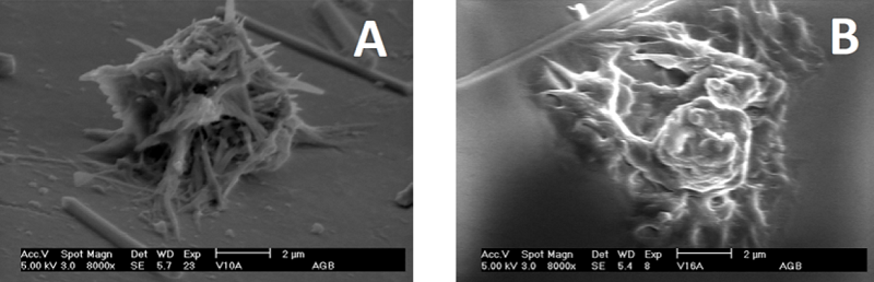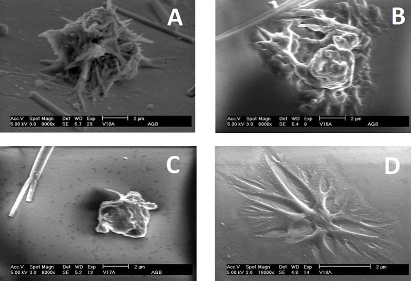 En las muestras 4 y 20 (Figuras 5A y 5B respectivamente) se aprecian excavaciones ocupadas por estructuras poliédricas, que quizá sean cristales inorgánicos de calcio, oxalatos, óxidos, sulfatos o de otros componentes, formados por la interacción del entorno. Asimismo, en la superficie lisa de las muestras 6 y 10 se observa adherencia en forma de barra, y en la 14, de estructura esférica. En las muestras 10, 16, 17 y 18 (Figura 6) las adherencias son de forma irregular, por lo que, se supone, son de origen biológico. Investigaciones previas de esto reportan adherencias de este tipo; sin embargo, los registros fotográficos no presentan similitud a lo observado en la presente investigación, por lo que es posible que las variaciones resulten de la presencia de diferentes bacterias u otros microorganismos que ameriten ser cultivados en condiciones semejantes para su identificación. El fragmento de la muestra 9 presenta en su superficie adherencia de tipo grumoso y filamentoso, que podría ser la manifestación de una colonia de hongos (Figura 7), semejante a la reportada en investigaciones anteriores (Andrejevna y Aldona, 1999, pp. 181-191).