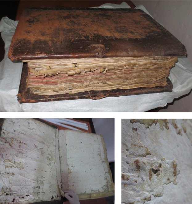 Al momento del tratamiento de los libros, éstos se encontraban en mal estado de conservación y con una infestación de termitas activa (Cryptotermes brevis), localizada principalmente en las tapas (Figura 3), a pesar del tratamiento con Prematek cinco años atrás. El Libro 23, que sirve como ejemplo en este informe, presentaba roturas en la cubierta y faltantes del soporte en las esquinas. Si bien la madera de las tapas aparentaba estar fuerte y mantenerse íntegra, en la cubierta se observaron orificios del ataque de insectos y detritus (residuos de descomposición del material). Las guardas estaban pegadas por una tela y adhesivos orgánicos, que podrían haber servido de alimento a los xilófagos.