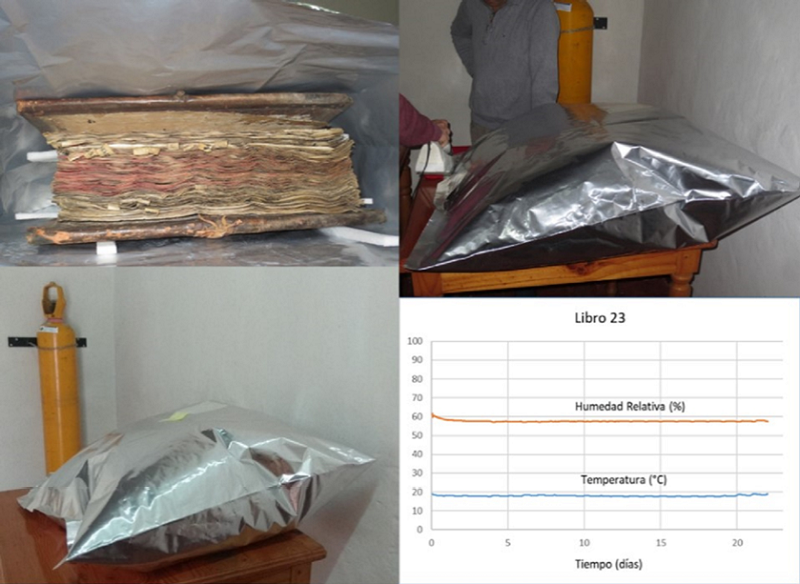 En total se trabajó con nueve libros, que se sometieron a un tratamiento anóxico con nitrógeno gaseoso e inhibidor de oxígeno, aunque algunos, sólo con inhibidor (Figura 2). El protocolo de tratamiento fue sugerido por la especialista en microbiología, la doctora Nieves Valentín, quien se había retirado recientemente del Instituto del Patrimonio Cultural Español (IPCE). Esto fue realizado en una segunda etapa de capacitación en el museo.