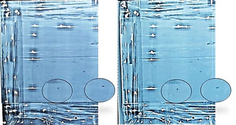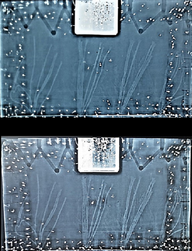 La eficiencia de la desinsectación es difícil de verificar y evaluar. En unas muestras especialmente diseñadas para facilitar la recolección del material celulósico procesado por los insectos, Chidichimo y compañía comprobaron el cese de su actividad pesando dicho material después de su tratamiento (Chidichimo, Dalena y Beneducci, 2015, p. 270). En este caso, para la verificación de la eficacia del tratamiento se decidió comparar las placas radiográficas tomadas del Libro 15 (control, no sujeto al tratamiento anóxico), con un intervalo de 173 días entre las tomas de placas. Como puede apreciarse en la Figura 5, en el periodo de poco menos de seis meses entre los análisis, el daño causado por las termitas aumentó en las tapas del libro control, donde las cavidades se extendieron y se ramificaron.