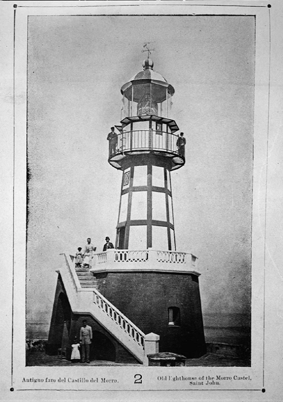 La historia del Faro de El Morro de San Juan se caracteriza por varias etapas constructivas e intervenciones. En 1846 se construyó, según los Archivos Centrales de los registros de recursos del sitio patrimonial resguardados por el National Park Service (NPS), y se lo considera el primero en Puerto Rico. Creado con antelación a la implementación del plan de alumbrado marítimo propuesto en 1869, que buscaba instalar 15 faros alrededor de la isla para proteger los puertos y rutas comerciales estratégicas entre Europa y América, su huella aún se aprecia en el baluarte suroeste del Fuerte. El segundo (Figura 2), de 1876, también tenía planta octogonal y una base de mampostería de ladrillo recocido, con una torre metálica de 174 pies de altura (National Park Service, 1978-88).