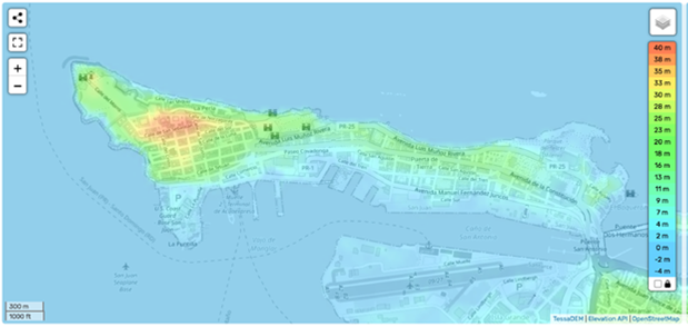 El contexto geofísico de Puerto Rico se originó con la colisión de dos placas tectónicas, la de Norteamérica y el Caribe; eso dio lugar a la formación tanto de las Antillas como de la Fosa de Puerto Rico, el punto más profundo del Atlántico. Con el Viejo San Juan -donde la geología comprende rellenos artificiales, depósitos de playa, con suelos cerca de acuíferos y aluviones-, la topografía es diversa (Figura 3), en una zona costera plana a nivel del mar, pero el Castillo de San Felipe de El Morro se alza en un mogote estratégico, que fue utilizado para la construcción de un fuerte de vigilancia y la ubicación del Faro (Quiñones y Torres, 2005, p. 4).