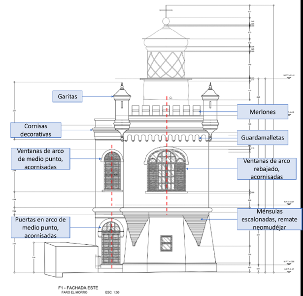 En términos de morfología, el Faro de El Morro del Viejo San Juan presenta elementos ornamentales que reflejan la influencia del neoclasicismo y la reminiscencia del neomudéjar. La simetría en la fachada del segundo cuerpo, incluidas ventanas y persianas, junto al uso de cornisas que enmarcan el inmueble y sus vanos, establecen un lenguaje arquitectónico distintivo de estos estilos. Pueden observarse también guardamalletas, acentos en las ventanas con arcos de medio punto o rebajados en la decoración con cornisas, que se repiten en las fachadas interiores. La utilización de merlones con perfil rectangular en el remate del inmueble simboliza su función de protección. Las garitas de concreto añadidas posteriormente ponen énfasis en el carácter militar del bien edificado. La planta baja muestra influencias de la etapa española inicial, por el espesor de sus muros y la calidad del ladrillo, mientras que la linterna, construida con hierro colado y cristal, se relaciona con la revolución industrial (Figura 5).