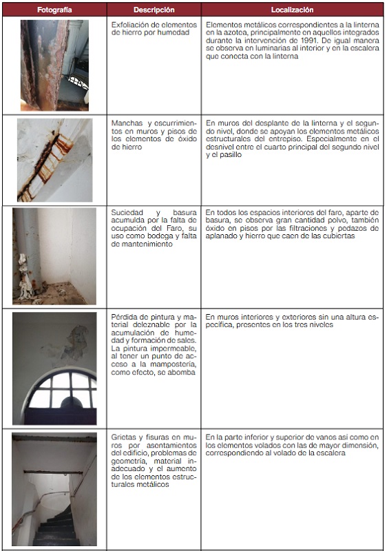 En el Faro destacan los deterioros relacionados principalmente con la falta de mantenimiento, observables en los acabados del inmueble, tanto en interiores como en exteriores. Éstos han sido ocasionados por filtraciones de agua en la cubierta y problemas estructurales, debidos a la geometría del edificio, que ha derivado en grietas y fisuras de los elementos en cantiléver. A lo anterior se suman factores del medioambiente costero, que promueven la corrosión en elementos metálicos, la aparición de eflorescencias en muros y también en éstos, el desgaste de los elementos de mampostería. Además, mediante la observación in situ se identificó que los materiales usados en diferentes etapas reaccionan de manera diferente a su entorno, determinando que (Figuras 6 y 7):