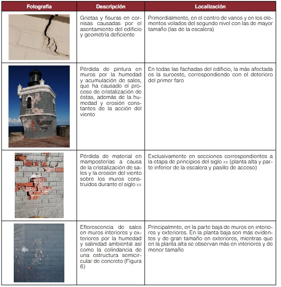 El inmueble ha perdido elementos del sistema original; no obstante, gran parte de la infraestructura eléctrica original aún se conserva in situ. Se considera importante que éste siga cumpliendo su función como parte del sistema de señalamiento marino, ya que da continuidad al valor histórico del edificio y del fuerte. Por el contrario, el análisis contextual acentúa la ubicación del bien patrimonial sobre una fortaleza del siglo XVI, lo que dificulta una evaluación adecuada de su cimentación, debido al constante flujo de visitantes. Los deterioros físicos del edificio son consistentes con la calidad de los materiales, lo cual es evidente en los diferentes grados de deterioro en cada una de las etapas. Un ejemplo de esto, que ya hemos mencionado, es el ladrillo de barro rojo recocido español fabricado en el siglo XIX, que tiene dimensiones aproximadas de 28 x 21 x 7 cm6 y de composición densa, mientras que el ladrillo de barro rojo de fábrica estadunidense tiende a ser más ligero, poroso, menos denso y de dimensiones pequeñas (2 x 4 x 8”). Al comparar ambos ladrillos, hoy expuestos dada la falta de aplanados,7 el ladrillo estadunidense presenta una mayor erosión y eflorescencias que el español.8