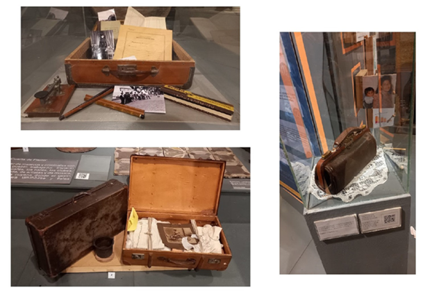En esta última exposición, además de los códigos QR con enlaces al audio referido a cada uno de los espacios expositivos y paneles, se incluyeron otros códigos QR con relatos de personas relacionadas con algunos objetos. Por medio de ellos se compartió una anécdota o experiencia de la vida familiar en estrecha relación con el fenómeno inmigratorio. Un ejemplo de esto fue una valija, perteneciente a un empleado del ferrocarril “Buenos Aires al Pacífico”, con objetos de papelería e instrumental ferroviarios, en la voz de una de sus nietas, quien recuperaba la historia de su abuelo y de su esposa inmigrante.