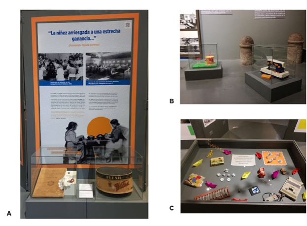 En relación con el guion museológico, se tuvo mayor preocupación en garantizar la accesibilidad de los contenidos, tanto en lo cognitivo como en lo físico, dando prioridad a textos cortos y soportes museográficos y visuales claramente señalizados. Así, se consideró especialmente la altura de las vitrinas y del mobiliario museográfico. También incorporamos códigos QR con enlaces de audio que abordaban el contenido de cada panel (Figura 9).
