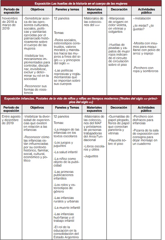 En este apartado desarrollamos un análisis de los elementos transversales y las experiencias en torno a las tres exposiciones llevadas adelante. En el siguiente cuadro se sintetiza información acerca de las mismas (Figura 6).