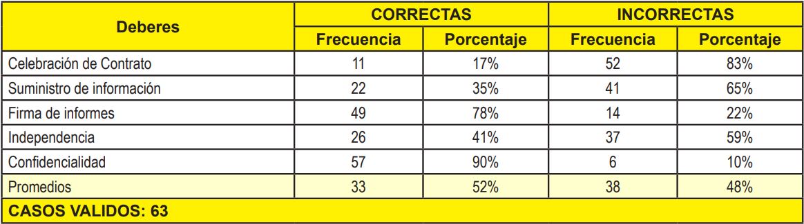 Al indagar sobre los Deberes del Contador Público con sus Clientes; (a) celebración de Contrato; (b) suministro de información; (c) firma de informes; (d) independencia; y (e) confidencialidad Tabla y Gráfico 2, el 52% de los estudiantes respondió de manera correcta, por lo cual puede inferirse que el conocimiento de los estudiantes de Contaduría Pública del NURR acerca de los deberes del contador público con sus clientes, según la Escala de Estimación para el Análisis de Resultados (Cuadro 1) es medio. Se puede inferir, por tanto, que el no tener claridad absoluta de los deberes con sus clientes puede ocasionarle problemas en las relaciones con los mismos, durante el futuro ejercicio profesional.