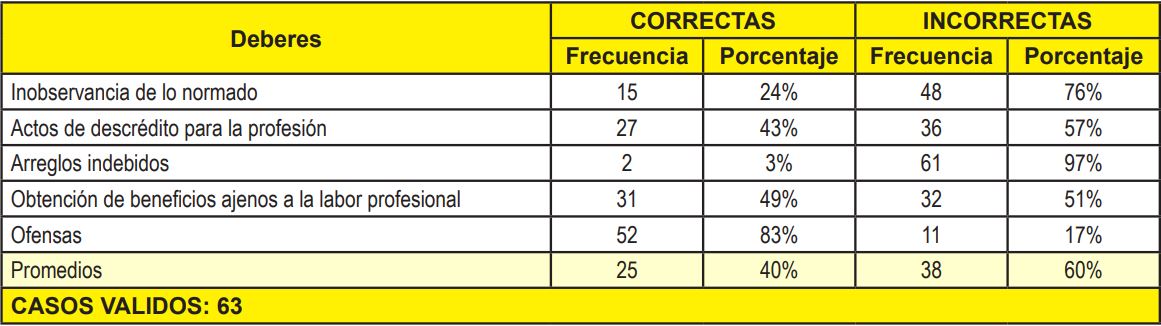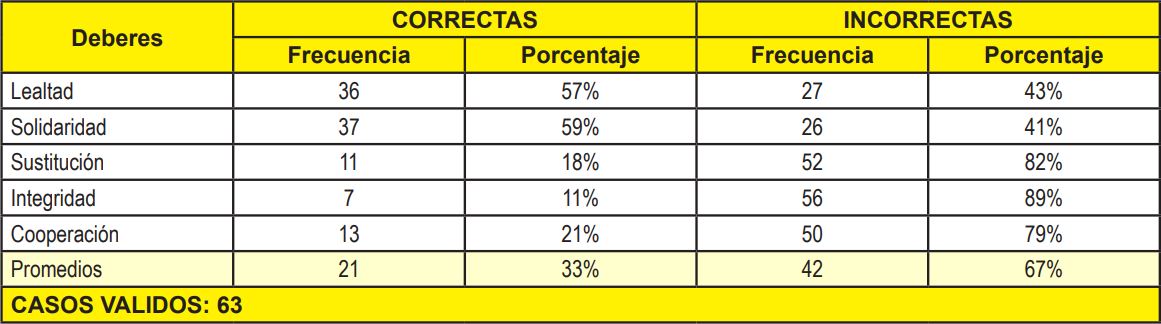 Por otro parte, en cuanto a los Deberes del Contador Público con sus colegas; (a) lealtad; (b) solidaridad; (c) sustitución; (d) integridad; y (e) cooperación, en concordancia con los resultados de la Tabla y Gráfico 3, se observa que sólo el 33% lo hizo de forma correcta, por lo que puede deducirse, siguiendo la escala de estimación que los estudiantes poseen un nivel conocimiento bajo acerca de dichos deberes, pudiendo esto afectar en alto grado las relaciones con sus futuros colegas.