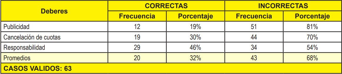 Ahora bien, en relación con los Deberes del Contador Público con el Gremio; (a) publicidad; (b) cancelación de cuotas; y (c) responsabilidad, de acuerdo con los resultados de la Tabla y Gráfico 4, se observó que según los estudiantes solo un 32% respondió correctamente. Esto refleja, que la mayor parte de los encuestados desconocen lo normado por el Código de Ética Profesional del Contador Público Venezolano (1996), en cuanto a dichos deberes. Como consecuencia de este desconocimiento, la conducta de los futuros contadores podría perjudicar la imagen de la profesión.