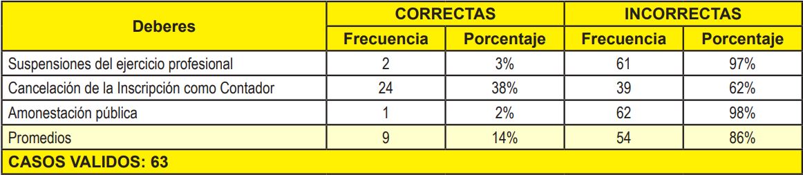 En cuanto a las sanciones: (a) suspensión del ejercicio profesional; (b) cancelación de la inscripción como Contador; y (c) amonestación pública, de acuerdo a la Tabla y Gráfico 6, se puede observar que el 14% de los encuestados respondió correctamente, por tanto, se infiere que los estudiantes de acuerdo a la Escala de Estimación utilizada tienen un nivel de conocimiento muy bajo, lo que les lleva a desconocer en su mayoría lo relacionado a dichas sanciones. Es indudable, que esta situación puede acarrear, que los futuros contadores incurran en situaciones que ameriten cualquier tipo de sanción, ya que no están conscientes de las consecuencias de las faltas que pudieran cometer.