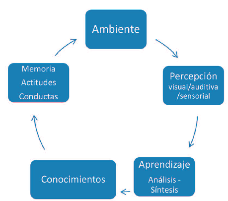 En el caso de la educación ambiental, obviamente el ambiente es el foco central, inicio y término de un proceso cognitivo continuo que incorporará los conocimientos adquiridos durante la consecución de las etapas que lo componen. El primer contacto con el ambiente se inicia mediante la percepción visual, auditiva y sensorial, la cual se obtiene de una fuente primaria de información percibida y procesada por el entorno comunitario inmediato. Esto es lo que se asigna como conocimientos ancestrales, populares que la población transmite oralmente de generación en generación. Aunado a ello se encuentra los procesos educativos formales sustentados en la acción de la escuela, donde el aprendizaje mediante las unidades didácticas es conducido y sujeto a la aplicación de procedimientos de análisis y síntesis para generar conocimientos avalados en la aplicación de metodologías. Estos conocimientos acumulados a su vez se proyectarán en actitudes y conductas hacia el ambiente o entorno social, desde donde se volverá a iniciar el ciclo, lo cual puede representarse gráecamente como: