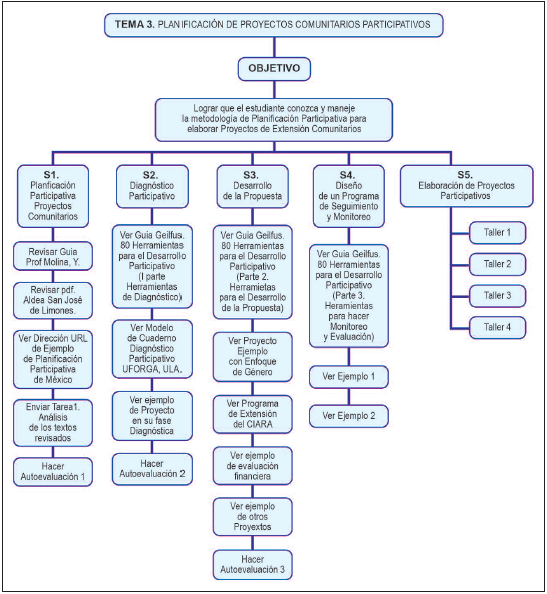 Detalle de los elementos que conforman la Estructura del tema 3 del Curso de Trabajo I de Extensión: Planificación de Proyectos Comunitarios Participativos.