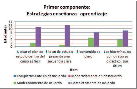 Como se puede observar en el Gráf. 1 del componente estrategias de aprendizaje, en cuanto a la ubicación del plan de estudio de la asignatura Trabajo I de Extensión dentro del curso es fácil, el 84,62% de los participantes están completamente de acuerdo, lo cual hace inferir que es cómodo de seguir por los estudiantes, porque les permite de manera rápida observar los materiales didácticos (temas, guías, páginas web, ejemplos) alojados en la plataforma, así como las actividades a realizar por ellos como lo son tareas, glosarios, foros, taller y autoevaluaciones. Igualmente presenta una secuencia clara, según el 92,31% de los participantes que dice estar completamente de acuerdo, porque presenta un orden adecuado en las instrucciones para cada sesión y los participantes no mostraron problemas para realizar todas las actividades asignadas y los resultados de aprobación fueron satisfactorios.