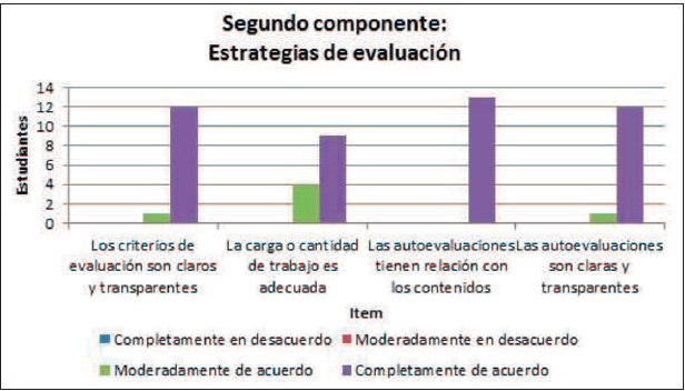 En el componente evaluación tenemos que se realizaron 4 autoevaluaciones con preguntas de selección simple y ponderaciones cuantitativas directamente relacionadas con los contenidos de la asignatura y, como se muestra en el Gráf. 2 , el 100% de los participantes dice estar completamente de acuerdo con el diseño de las autoevaluaciones y su relación con los contenidos dictados, permitiéndoles autoevaluarse, mientras que al profesor le permite observar si se está dando el proceso de enseñanza-aprendizaje en línea adecuadamente, así mismo contribuye a aclarar las dudas y preguntas que aun persistan, siendo los resultados de las evaluaciones altamente satisfactorios.