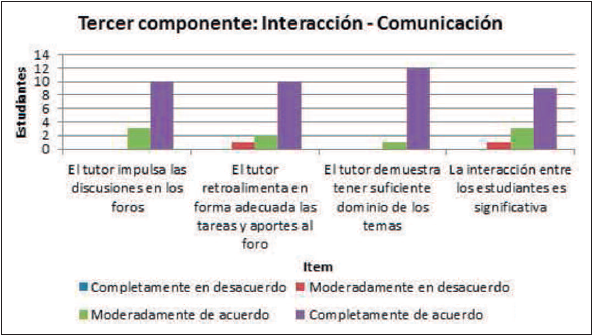 - Tercer Componente. Interacción-Comunicación: permite conocer cómo fue el proceso de interacción profesor-alumno y alumno-alumno, así como las fortalezas y debilidades del proceso educativo en línea.